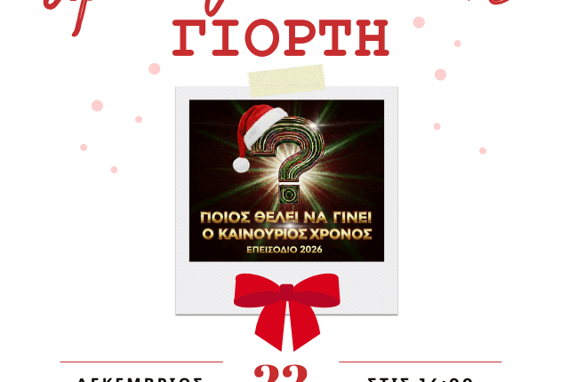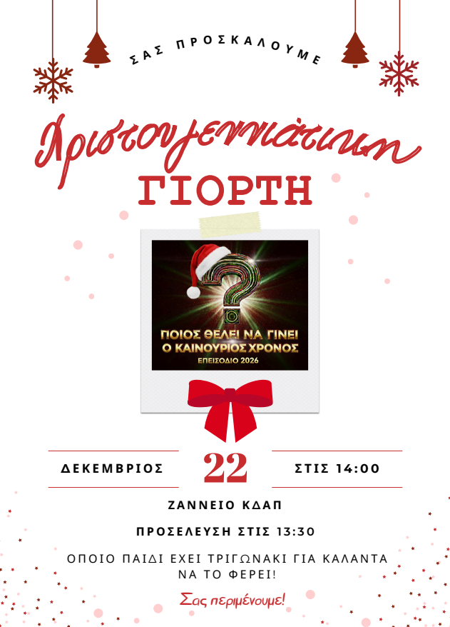 Τα Χριστούγεννα πλησιάζουν και η μαγεία τους αρχίζει ήδη να φωτίζει τις καρδιές μας! Με χαρά σας ανακοινώνουμε ότι ετοιμάζουμε μια ξεχωριστή χριστουγεννιάτικη γιορτή, γεμάτη χαμόγελα, μουσική και πολλές εκπλήξεις. Μικροί και μεγάλοι θα ζήσουμε από κοντά το γιορτινό πνεύμα. Θα τραγουδήσουμε κάλαντα, θα παίξουμε και φυσικά θα συναντήσουμε τον… Άγιο Βασίλη!